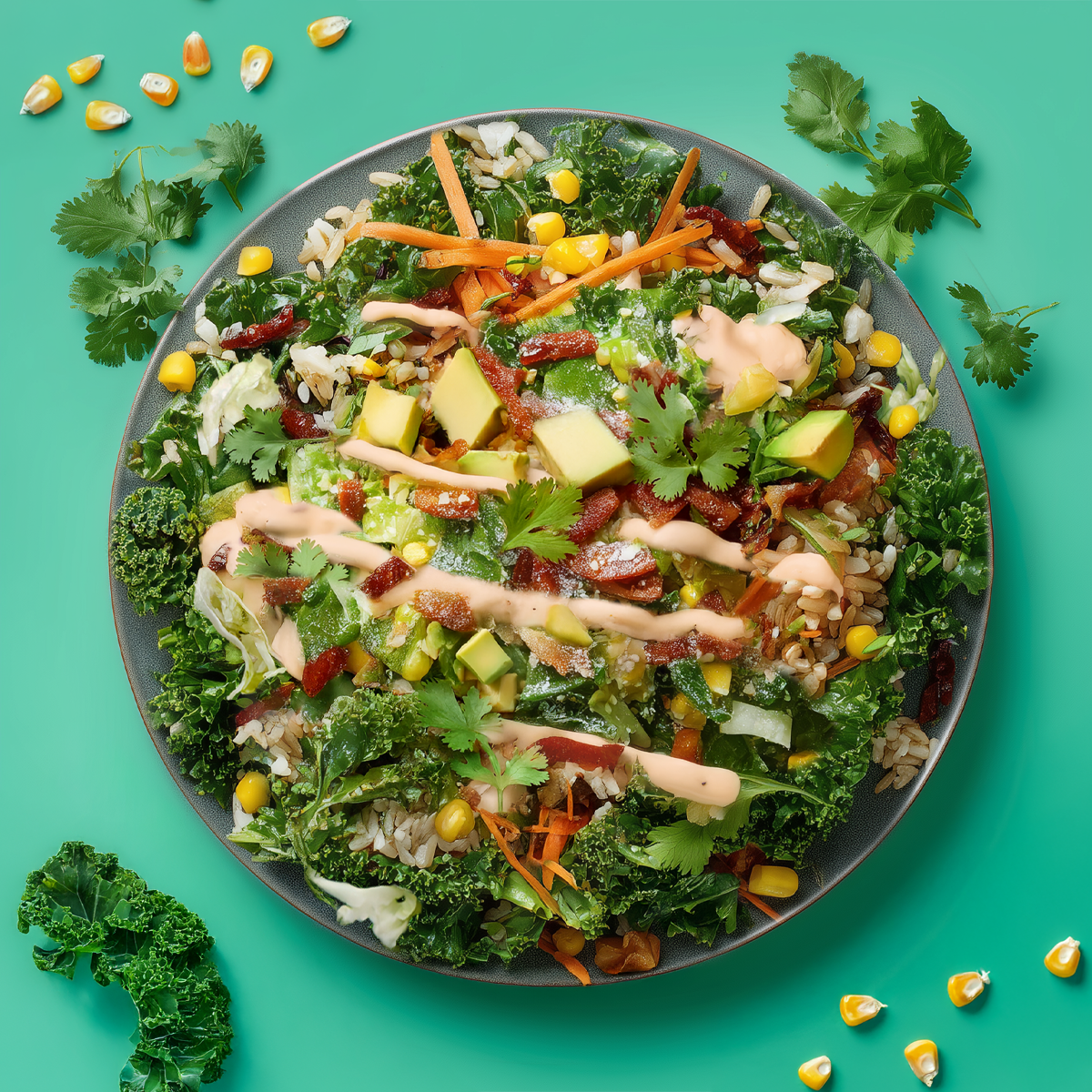 A summer salad with serious kick. Think charred chorizo strips, sweet corn kernels, avocado cubes and crunchy cabbage, all tossed through brown rice, kale and carrot. Add creamy French dressing, Green Goddess, a touch of chilli mayo and a sprinkle of parmesan and coriander, and you’ve got flavour that brings the fiesta to lunch.
